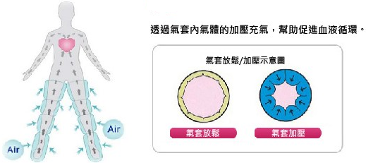 ● 原理(lǐ): 利用(yòng)氣套內氣體的加壓充氣,幫助促進血液循環,以達到按摩或減輕肌肉疼痛的作(zuò)用(yòng)。