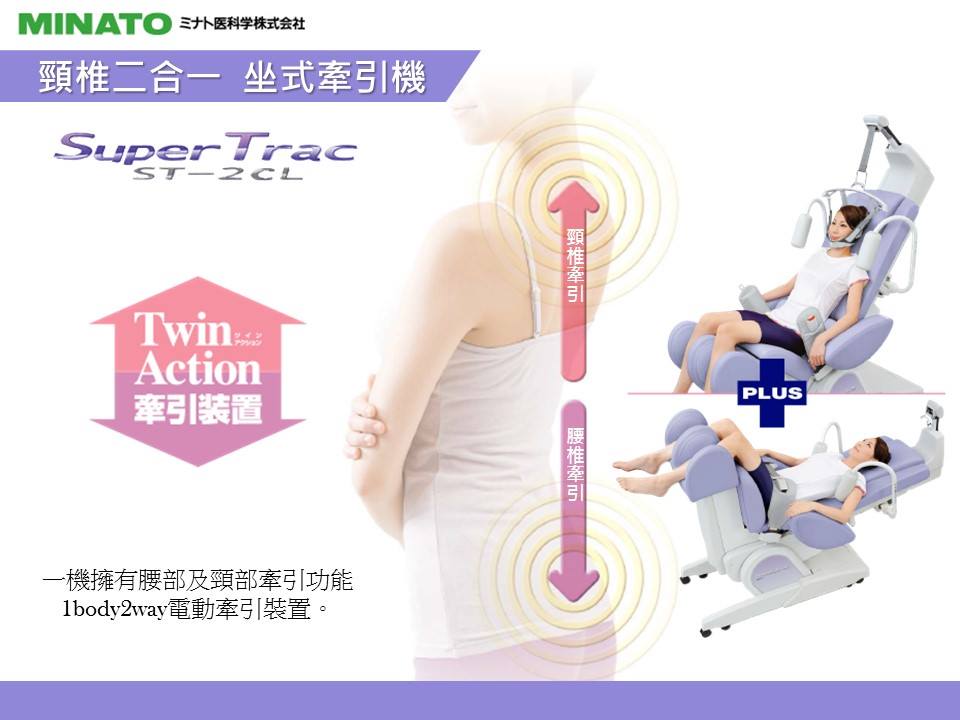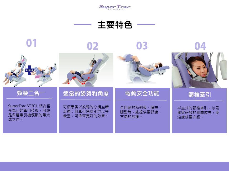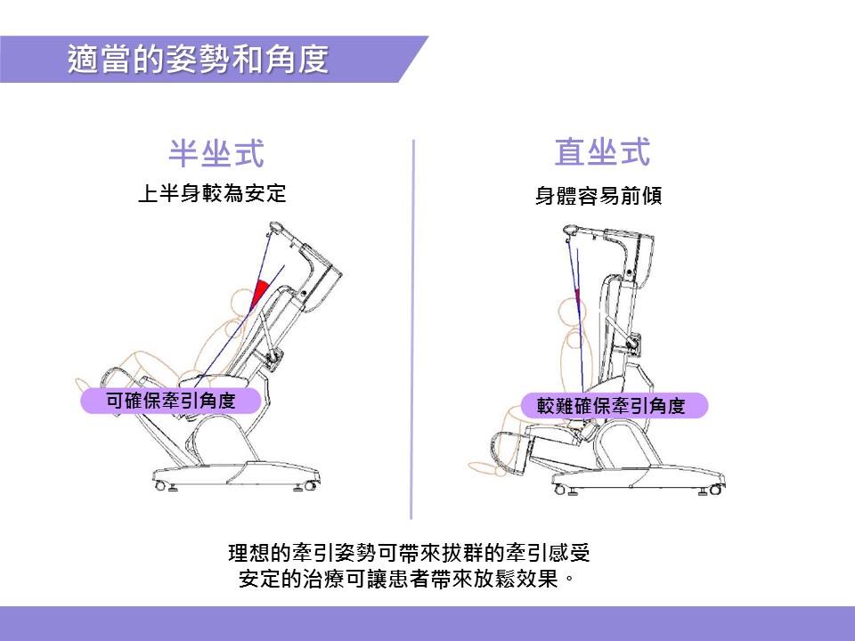 透過傾斜座椅的設計讓使用(yòng)者的上半身更加穩定,再加上牽引角度可(kě)做設定調整、3D包覆型的配件可(kě)以更完整的固定頭部。